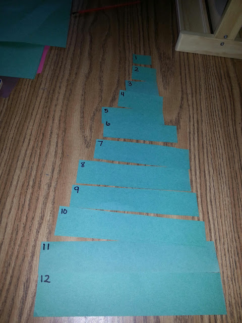 We made these awesome Christmas trees for the 12 days of Christmas. We counted, cut, and pasted green strips down. I wrote the numbers and had the kids see what they could recognize.